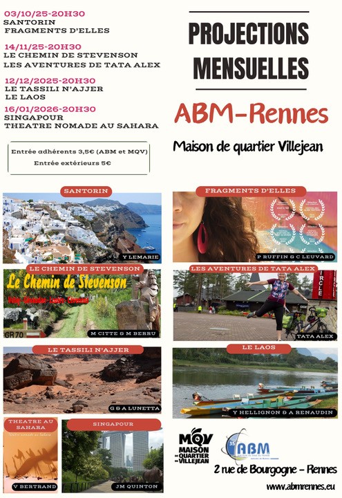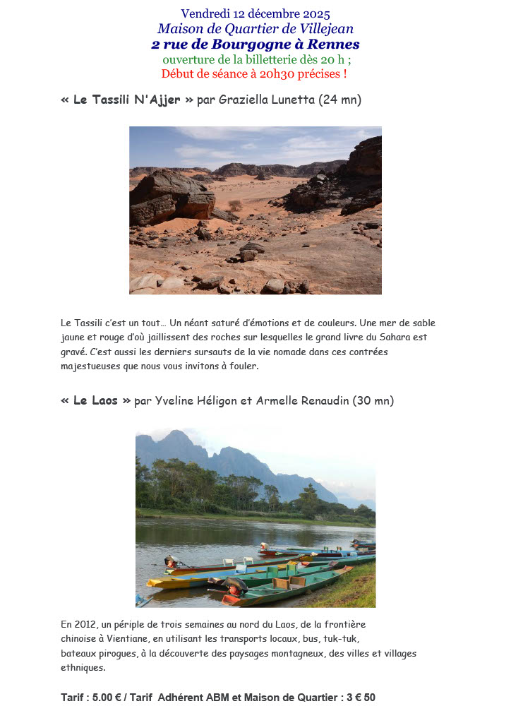ABM-Rennes vous propose deux projections :Bodnath au Népal, par Jean-Michel Quinton (10 mn)En népalais, Bodnath signifie le village du Bouddha, et ce qui symbolise précisément l’esprit du Bouddha, c’est le stupa. D’une hauteur de 40 mètres, ce monument est le plus grand édifice religieux de la vallée de Katmandou. Bodnath abrite la plus grande population de tibétains du pays.Les nombreux monastères font de ce lieu l’un des grands centres du bouddhisme tibétain. Pendant les cérémonies, les fidèles psalmodient les mantras, hymnes sacrés qui facilitent la méditation.Ici, la religion ne s’enferme pas entre quatre murs. Les fidèles déambulent autour du stupa dans le sens des aiguilles d’une montre. Je suis étonné et émerveillé par l’énergie qui anime ce lieu.Le Sud du Pérou par Joseph Delaunay(60 mn)Cette région offre une grande diversité de paysages, et de nombreux sites témoins de civilisations aujourd’hui disparues.Cuzco, capitale de la civilisation Inca, est devenue une ville coloniale Espagnole. Aux alentours de Cuzco de nombreux sites archéologiques sont situés dans des cadres naturels magnifiques, comme le Machu Picchu et la Vallée Sacrée, qui nous montrent les prouesses techniques des Incas. Le canyon de Colca, dans la vallée du même nom, est le plus profond au monde.La civilisation de Nazca, assez méconnue, nous a laissé des dessins appelés géoglyphes qui ne sont visibles que d’avion.